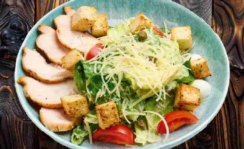 на выбор: с куриное филе или креветками, с миксом салата,томатами черри, сыром пармезан, перепелиным яйцом, чесночными гренками, каперсами и соусом цезарь
