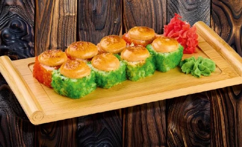 запечённый острый ролл с лососем, крабовыми палочками, японским омлетом, авокадо, свежим огурцом, икрой тобико и соусом спайси
