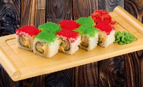 ролл с тигровыми креветками, свежим огурцом, дайконом, сыром креметте с чили и икрой тобико
