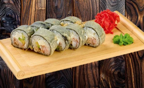 запечённый ролл в кляре с тигровыми креветками, угрём, авокадо и сыром креметте