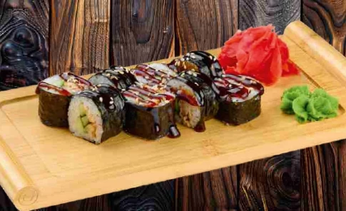 классический ролл с копчёным угрём, свежим огурцом, кунжутом и соусом унаги