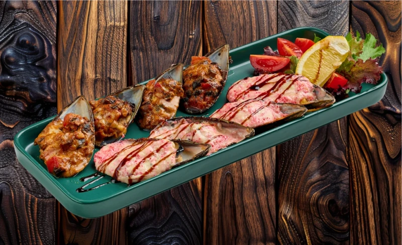 микс запеченных мидий: с соусом том ям и сырным ассорти с икрой тобико
